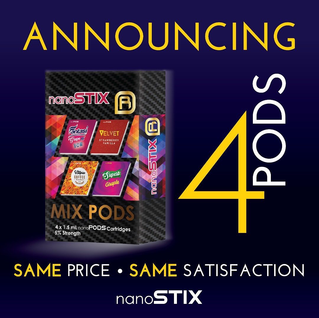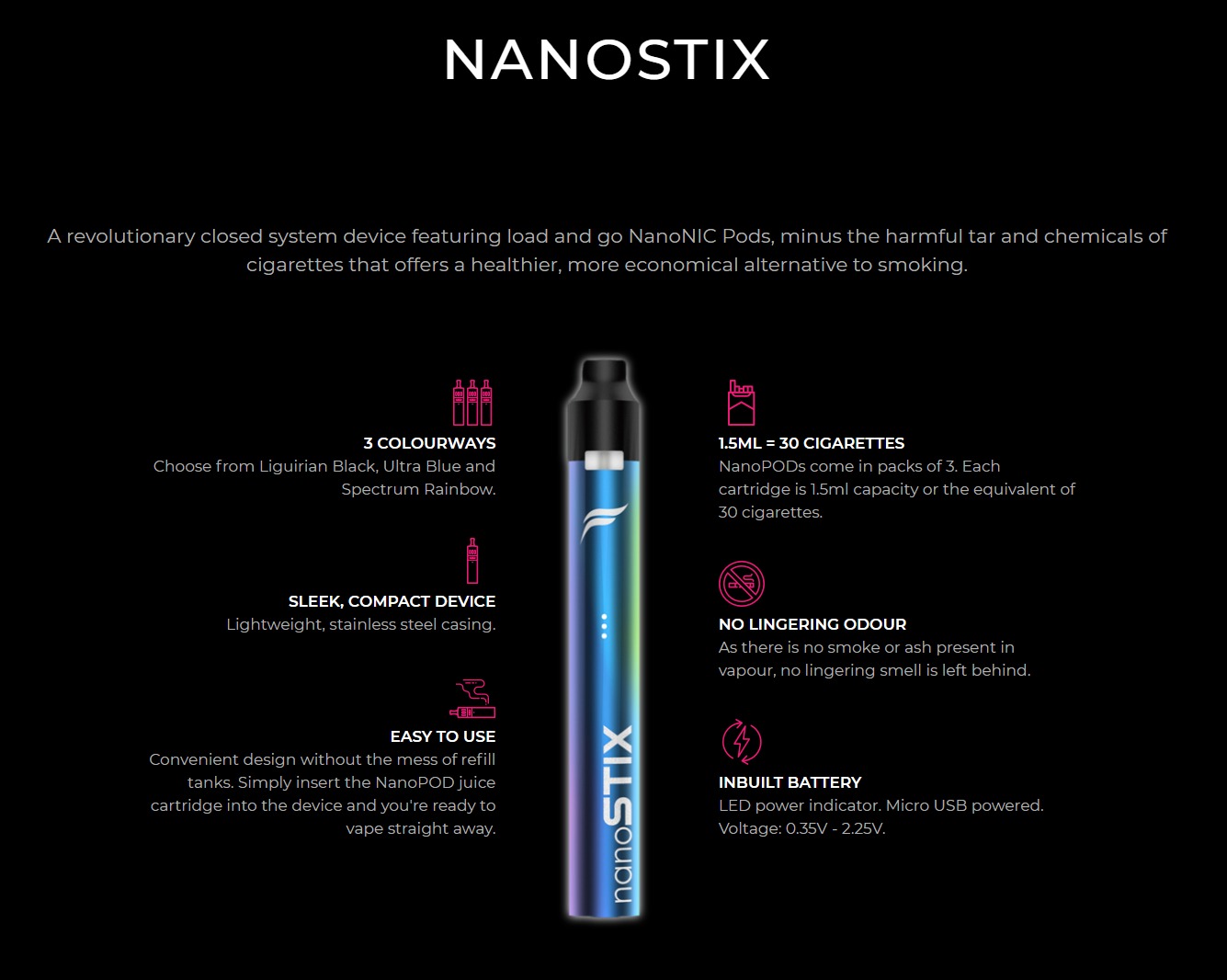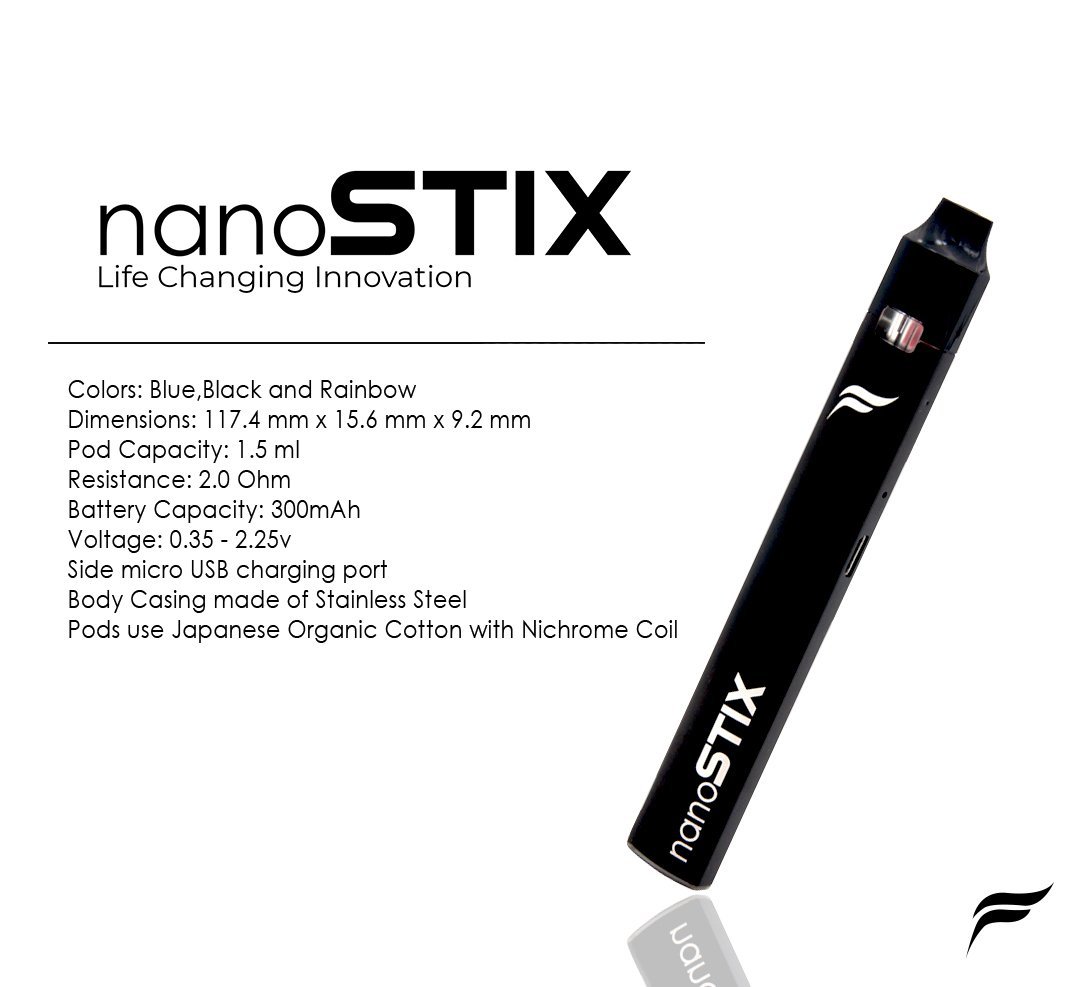Introducing NanoSTIX – the revolutionary closed system vaping device combining NanoNIC technology to guarantee vapour satisfaction and efficient nicotine delivery every time. The Nanostix by Fantasi brings you the next evolution in smoking devices. Small, compact and easy to use, the Nanostix is perfect for those moving from cigarettes and the usual nicotine strength in vaping is not sufficient. Each Nanostix starter kit also comes with 4 flavors (Strawberry Vanilla, Coffee Hazelnut, Grape & Graple).Specifications: Sleek, compact device Lightweight, stainless steel body Inbuilt battery with 300mAh capacity LED power indicator Micro USB charging port Resistance: 2.0 ohm Voltage: 0.35 – 2.25v Dimensions: 117.4 mm x 15.6 mm x 9.2 mmCompatible with: NanoSTIX Replacement Pods CartridgesBrand: NanoSTIX Model: Pod Starter Kit Max Tank Capacity: 1.5mL (2.0ohm heating coil) Battery Capacity: 350mAh Colour: Liguirian Black / Rose Pink / Spectrum Rainbow / Ultra Blue / Crimson RedUsage: Cutting edge designWhen the battery is fully charged, the LED light will turn off No buttons, just inhale to vape When the battery reaches below 3.8v, the LED will be blue. When the battery reaches below 3.6v, the LED will be red. When the battery is above 3.8v, the LED will be white. The system has a cutoff time of 10 seconds. If pulling for longer than 10 seconds, the device will stop. If the pod is not making proper connection with the system, on inhale the LED will blink red three times.Each set contains: 1X NanoSTIX Pod Device 4X NanoSTIX Replacement Pods Cartridge (Grape / Strawberry Vanilla / Coffee Hazelnut / Graple) 1X USB Cable 1X Warranty Card 1X User Manual